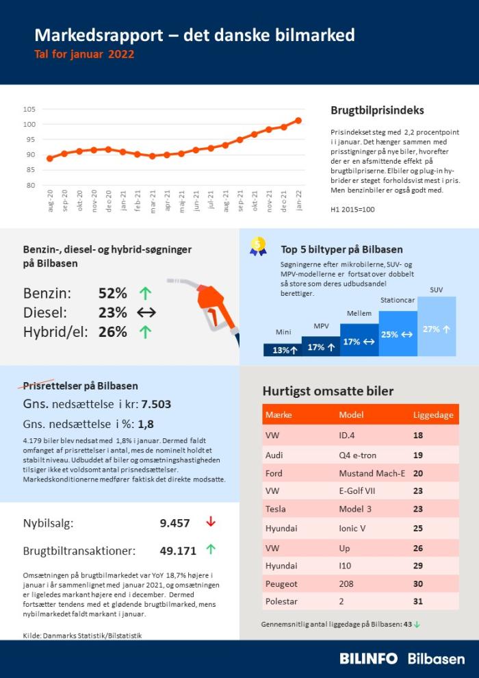 Effekterne af den høje omsætning og det lave udbud kan aflæses umiddelbart i to relaterede nøgletal. Bilbasens prisindeks (H1 2015=100) steg med rekordhøje 2,2 procentpoint i januar. Det hænger sammen med den høje efterspørgsel samt det faktum, at nybilpriserne steg markant i januar blandt andet som følge af afgiftsjusteringerne indbygget i L129. Samtidig er liggedagene nede på 43 dage i snit, det er heller ikke registreret i nyere tid.