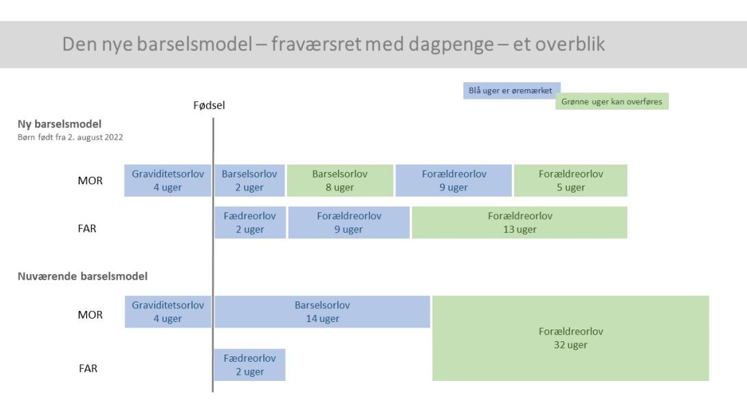 For at gøre overblikket lettere i forhold til mor og fars fraværsret og dagpengeret, kan du se en grafisk illustreret oversigt her, på billede 2 eller i vedhæftede pdf.