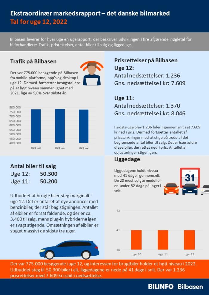 Der var 775.000 besøgende i uge 12, og interessen for brugtbiler holder et højt niveau i 2022. Udbuddet steg til 50.300 biler i alt, liggedagene er nede på 41 dage i snit. Der var 1.236 prisrettelser med 7.609 kr i snit i nedsættelse.