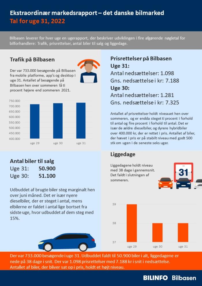 Der var 733.000 besøgende i uge 31. Udbuddet faldt til 50.900 biler i alt, liggedagene er nede på 38 dage i snit. Der var 1.098 prisrettelser med 7.188 kr i snit i nedsættelse. Antallet af biler, der bliver sat op i pris, holdt et højt niveau.