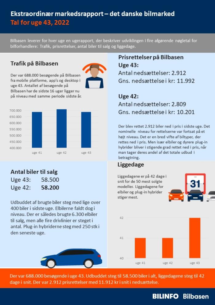 Der er flere biler til salg (godt 400) end i foregående uge, liggedagene for de mest solgte biler er nu oppe på 42 i snit, besøgende droppede igen til under 700.000, og antallet af prisrettelser er fortsat højt, både i antal og nominelt.