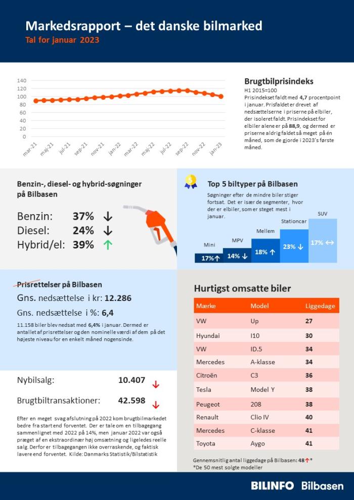For forbrugerne er der også gode nyheder. Den gennemsnitlige pris på brugte biler er faldet 14,5 procent siden oktober 2022, og alene i 2023 er den brugte bil blevet 1,9% billigere, svarende til 4.100 kroner. I øjeblikket koster en brugt bil i gennemsnit 162.000 kroner.