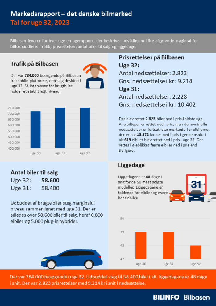 Der var 784.000 besøgende i uge 32. Udbuddet steg til 58.400 biler i alt, liggedagene er 48 dage i snit. Der var 2.823 prisrettelser med 9.214 kr i snit i nedsættelse.