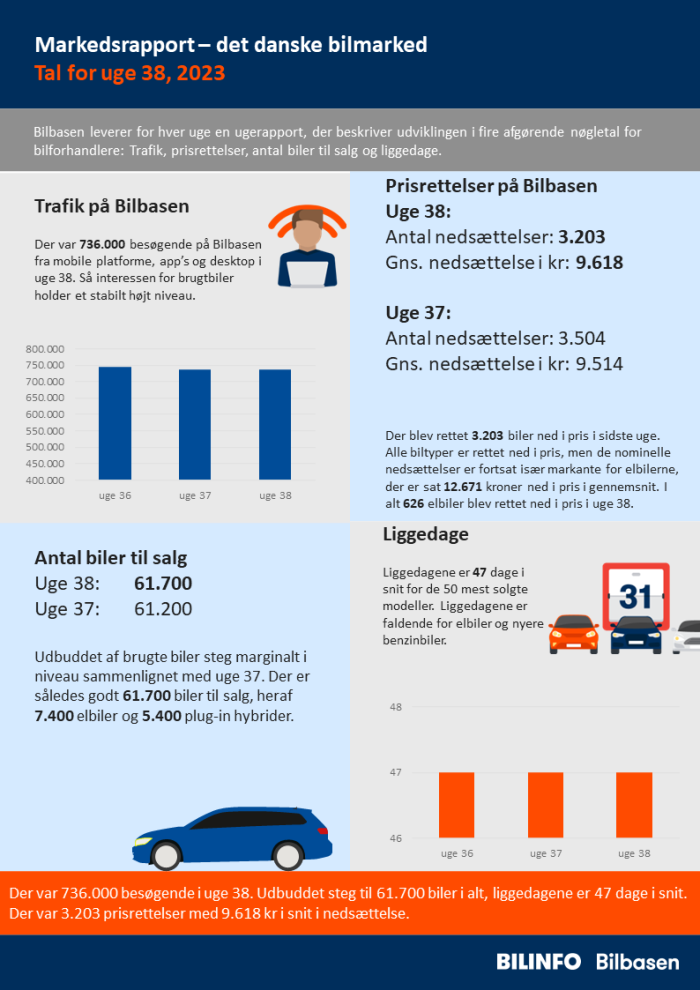 Der var 736.000 besøgende i uge 38. Udbuddet steg til 61.700 biler i alt, liggedagene er 47 dage i snit. Der var 3.203 prisrettelser med 9.618 kr i snit i nedsættelse.