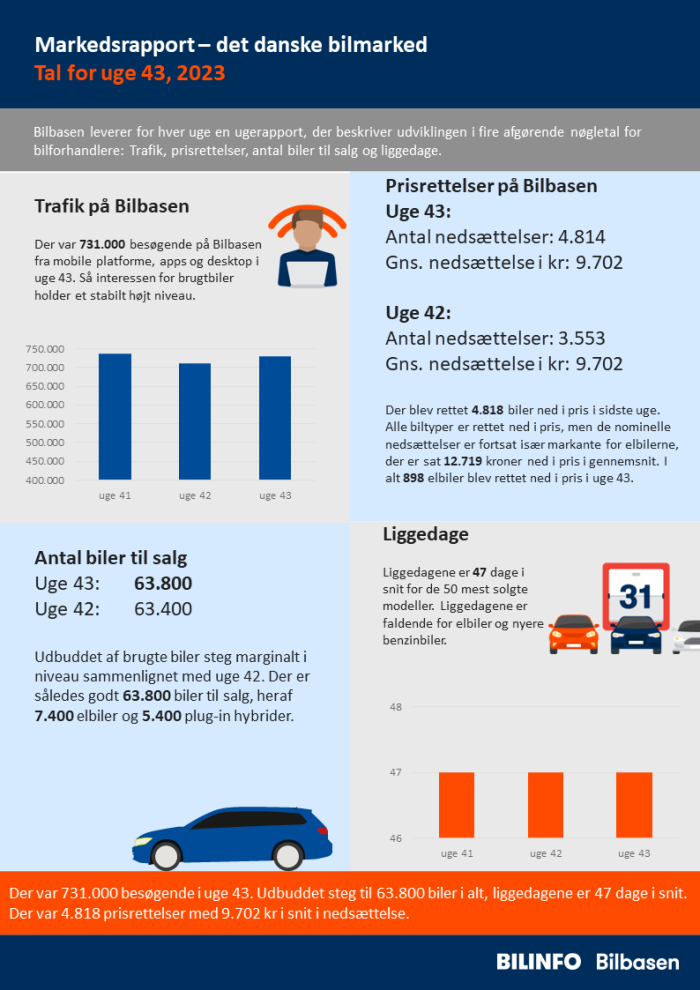 Der var 731.000 besøgende i uge 43. Udbuddet steg til 63.800 biler i alt, liggedagene er 47 dage i snit. Der var 4.814 prisrettelser med 9.702 kr i snit i nedsættelse.