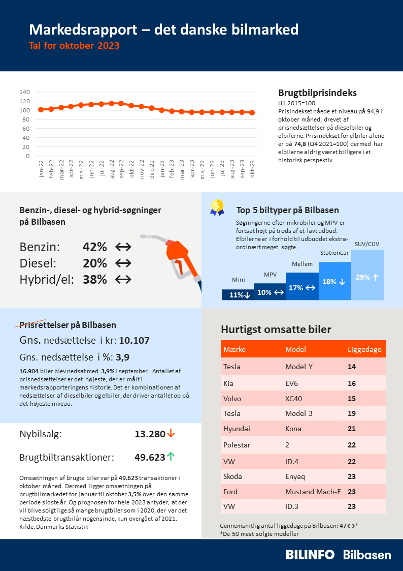 Helt overordnet holder brugtbilmarkedet fortsat moment med et totalt antal transaktioner på 49.623, hvilket er 13,1 procent højere end oktober 2022, og samlet er brugtbilmarkedet 3,5 procent oppe i forhold til 2022.