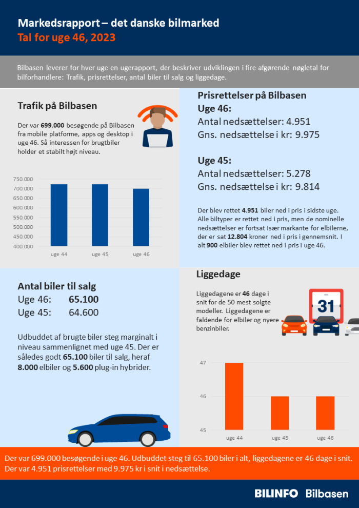 Der var 722.000 besøgende i uge 46. Udbuddet steg til 65.100 biler i alt, liggedagene er 46 dage i snit. Der var 4.951 prisrettelser med 9.975 kr i snit i nedsættelse.