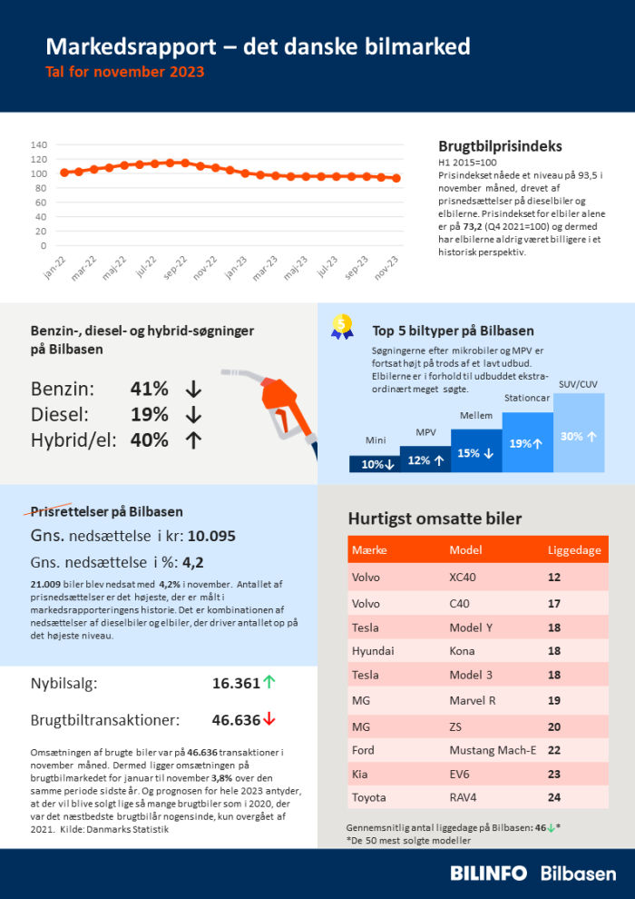 En af de afgørende årsager til det solide aktivitetsniveau er prisudviklingen på brugtbilmarkedet, hvor prisniveauet holder en let faldende trend på grund af prisnedsættelser på elbiler og dieselbiler. Indekset for november endte på 93,5, mens det isoleret set endte på 73,2 for de brugte elbilers vedkommende.