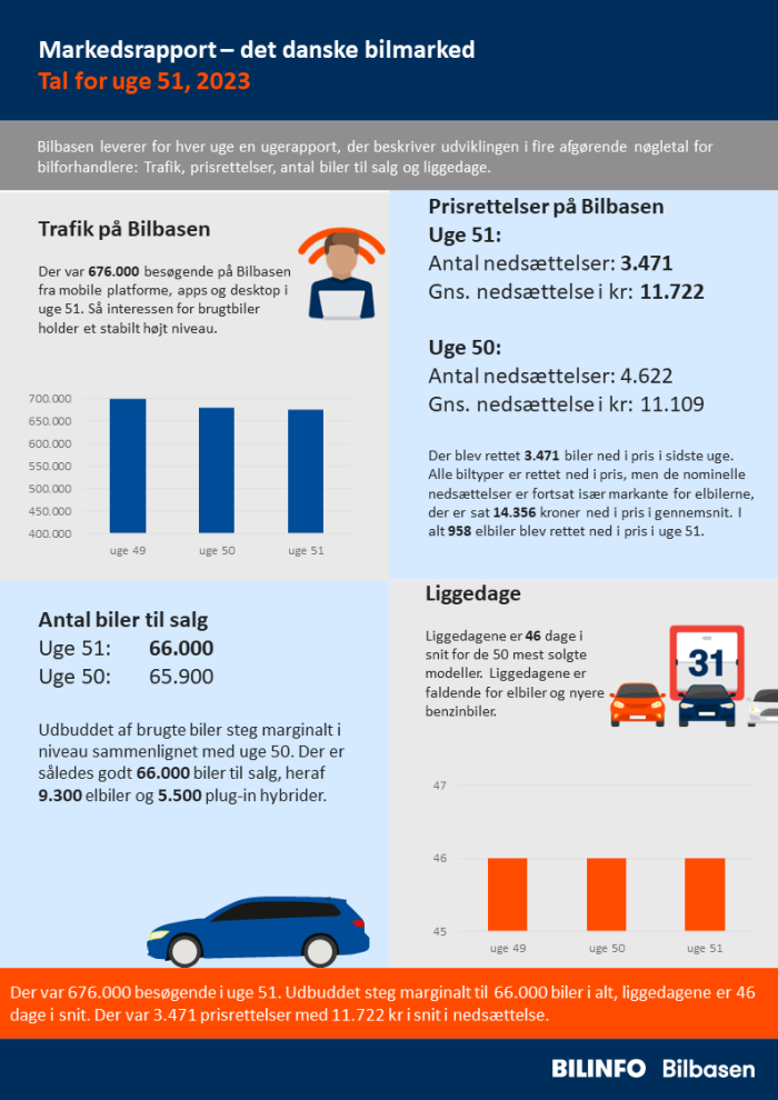 Der var 676.000 besøgende i uge 51. Udbuddet steg marginalt til 66.000 biler i alt, liggedagene er 46 dage i snit. Der var 3.471 prisrettelser med 11.722 kr i snit i nedsættelse.