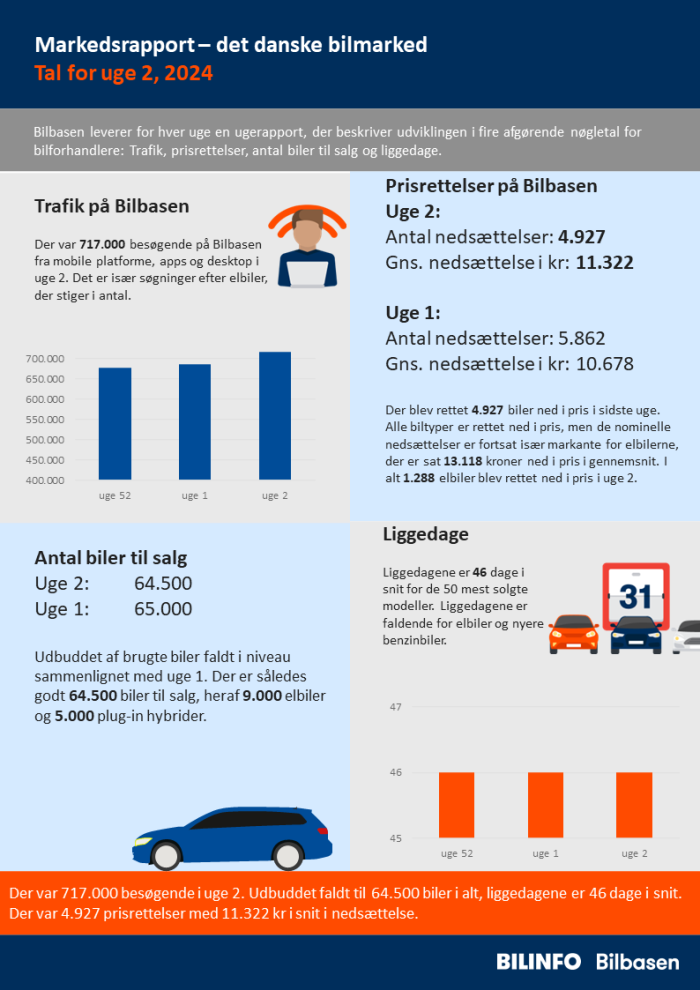 Der var 717.000 besøgende i uge 2. Udbuddet faldt til 64.500 biler i alt, liggedagene er 46 dage i snit. Der var 4.927 prisrettelser med 11.322 kr i snit i nedsættelse.