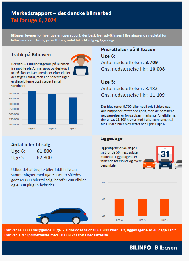 Der var 661.000 besøgende i uge 6. Udbuddet faldt til 61.800 biler i alt, liggedagene er 46 dage i snit. Der var 3.709 prisrettelser med 10.008 kr i snit i nedsættelse.