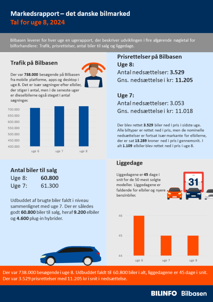 Der var 738.000 besøgende i uge 8. Udbuddet faldt til 60.800 biler i alt, liggedagene er 45 dage i snit. Der var 3.529 prisrettelser med 11.205 kr i snit i nedsættelse.