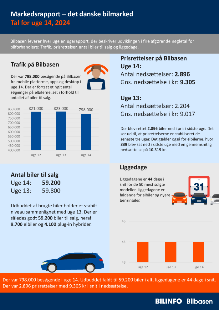 Der var 798.000 besøgende i uge 14. Udbuddet faldt til 59.200 biler i alt, liggedagene er 44 dage i snit. Der var 2.896 prisrettelser med 9.305 kr i snit i nedsættelse.