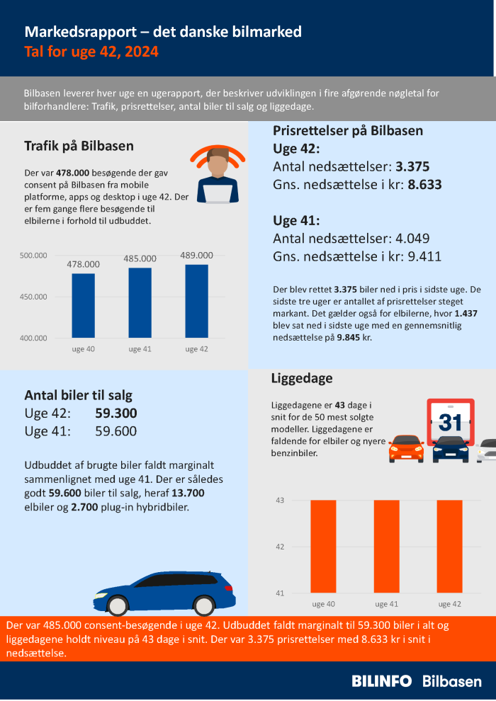 Der var 485.000 consent-besøgende i uge 42. Udbuddet faldt marginalt til 59.300 biler i alt og liggedagene holdt niveau på 43 dage i snit. Der var 3.375 prisrettelser med 8.633 kr i snit i nedsættelse.