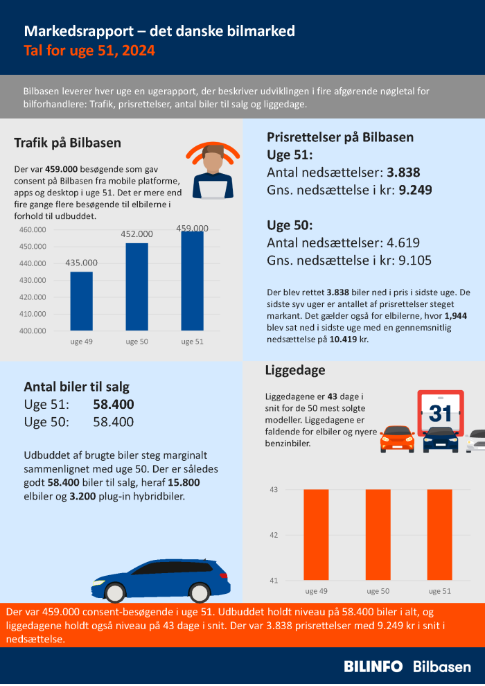 Der var 459.000 consent-besøgende i uge 50. Udbuddet holdt niveau på 58.400 biler i alt, og liggedagene holdt også niveau på 43 dage i snit. Der var 3.838 prisrettelser med 9.249 kr i snit i nedsættelse.