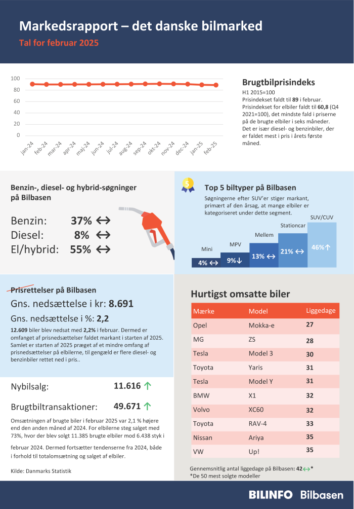 Den høje omsætning har også afsmittende effekt på priserne. Efter markante prisfald gennem hele 2024 og i januar 2025 aftog prisfaldene i februar, hvor det generelle prisindeks faldt med 0,4 procentpoint og elbilerne isoleret set faldt med 0,5% procentpoint - det laveste fald i seks måneder.