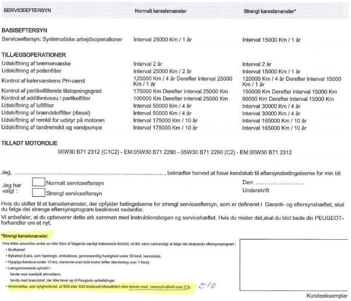 Der har været 5% bioethanol i benzinen siden 2010, men det er først nu, hvor de 5% forhøjes til 10%, at PSA ændrer betingelserne for henholdsvis "Normalt køremønster" og "Strengt køremønster".