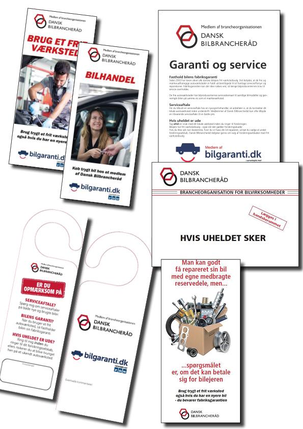 Et fælles træk for materialet er, at Dansk Bilbrancheråds budskaber skærpes betydeligt indenfor serviceaftaler, garanti, el-biler og især valg af forsikringsselskab, hvor vi naturligvis anbefaler et selskab, hvor der er frit værkstedvalg. Alt i alt stærke budskaber i en samlet materialepakke, der, hvis det anvendes rigtigt, kan nå ud til tusindvis af bilforbrugere for en beskeden økonomi. Budskaberne er korte og præcise og understøtter medlemmernes egen kommunikation med kunderne.