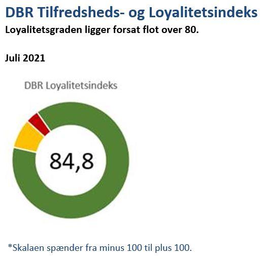 DBR loyalitetsscore måler løbende på medlemmernes loyalitetsindeks. Denne måned er indeks steget pænt fra juni til juli med 2,4 point fra 82,4 til 84,8*.