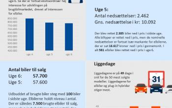 Der er ingen store udsving i nøgletallene for brugtbilmarkedet i uge 6. Med 581 prisjusteringer på elbiler ud af en bestand på godt 7.500 biler er omfanget af prisnedsættelser på niveau med gennemsnittet for fjerde kvartal 2022.