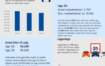 Nøgletallene for uge 30 indikerer relativt stabile tilstande på brugtbilmarkedet. Udbuddet af brugte biler var det samme som i uge 29 både generelt og for elbiler/plug-in hybrider.