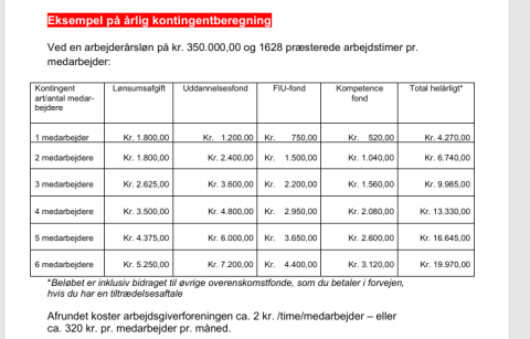 I billedet th. (klik på det) ses eksempler på beregning af medlemskontingentet for 1-4 medarbejdere. Beregningen ses også i vedhæftede folder "KORT FORTALT".