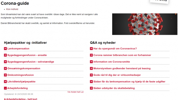 Dansk Bilbrancheråd har en komplet guide på hjemmesiden med svar på, hvordan du benytter de forskellige Corona-hjælpepakker, Link til siden: https://dbr.dk/corona-guide.