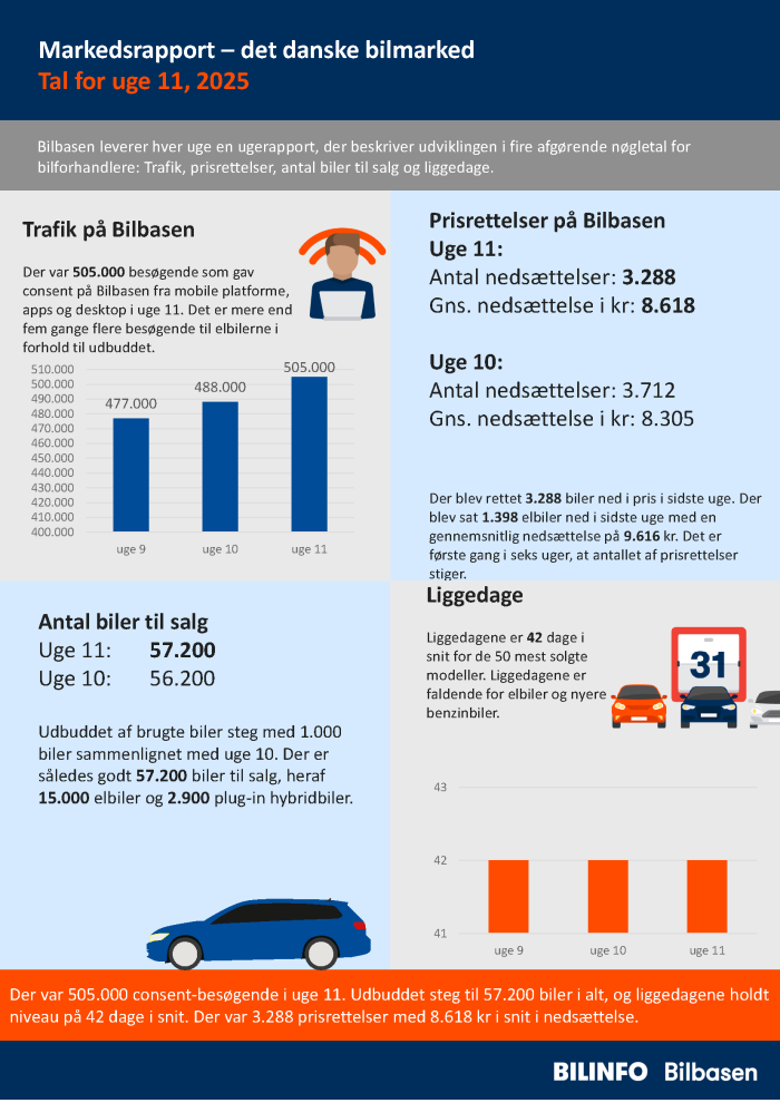 Der var 505.000 consent-besøgende i uge 11. Udbuddet steg til 57.200 biler i alt, og liggedagene holdt niveau på 42 dage i snit. Der var 3.288 prisrettelser med 8.618 kr i snit i nedsættelse.
