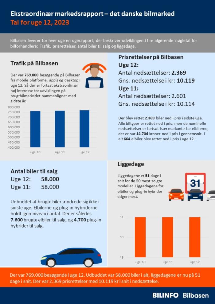 Der var 769.000 besøgende i uge 12. Udbuddet var 58.000 biler i alt, liggedagene er nu på 51 dage i snit. Der var 2.369 prisrettelser med 10.119 kr i snit i nedsættelse.