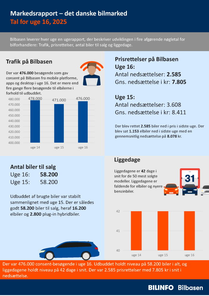 Der var 476.000 consent-besøgende i uge 16. Udbuddet holdt niveau på 58.200 biler i alt, og liggedagene holdt niveau på 42 dage i snit. Der var 2.585 prisrettelser med 7.805 kr i snit i nedsættelse.