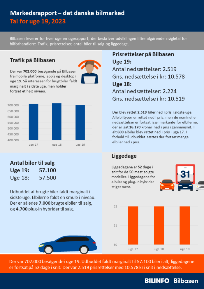 Der var 702.000 besøgende i uge 19. Udbuddet faldt marginalt til 57.100 biler i alt, liggedagene er fortsat på 52 dage i snit. Der var 2.519 prisrettelser med 10.578 kr i snit i nedsættelse.