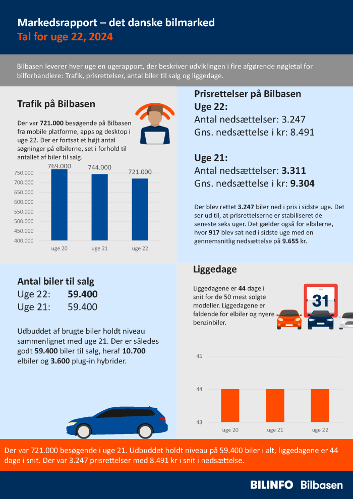 Der var 721.000 besøgende i uge 21. Udbuddet holdt niveau på 59.400 biler i alt, liggedagene er 44 dage i snit. Der var 3.247 prisrettelser med 8.491 kr i snit i nedsættelse.
