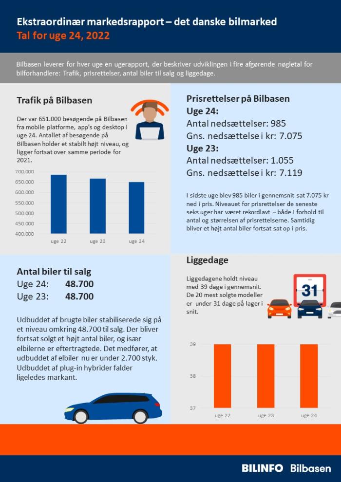 Der var 651.000 besøgende i uge 24. Udbuddet stabiliserede sig på 48.700 biler i alt, liggedagene er nede på 39 dage i snit. Der var 985 prisrettelser med 7.075 kr i snit i nedsættelse. Antallet af biler, der bliver sat op i pris, holdt et højt niveau.