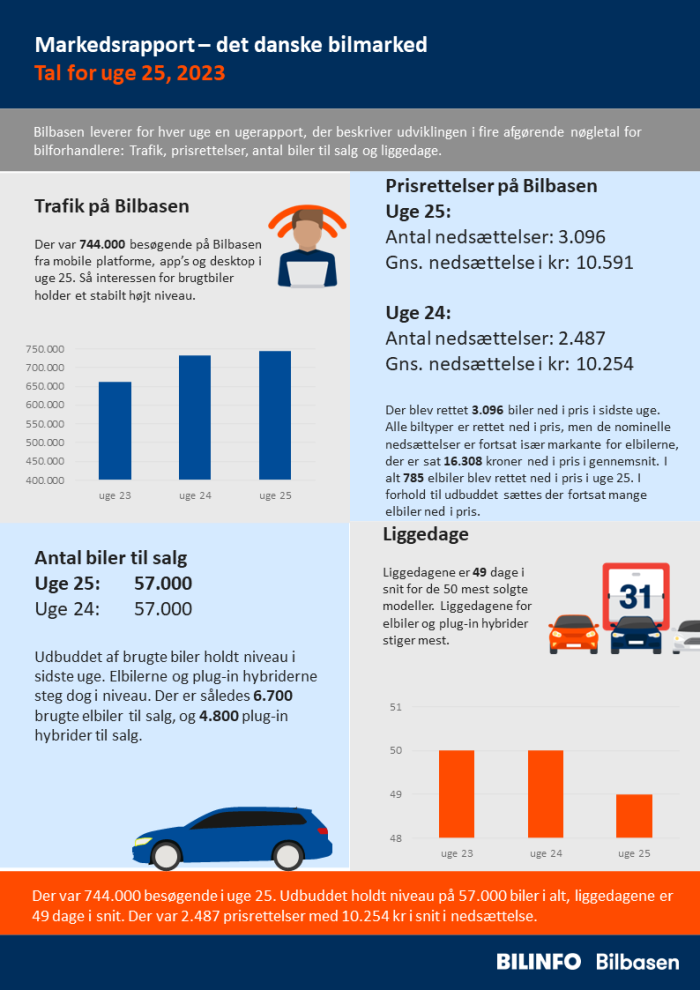 Der var 744.000 besøgende i uge 25. Udbuddet holdt niveau på 57.000 biler i alt, liggedagene er 49 dage i snit. Der var 2.487 prisrettelser med 10.254 kr i snit i nedsættelse.