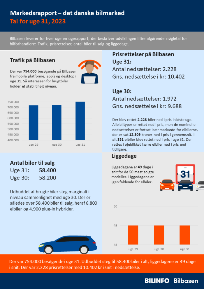 Der var 754.000 besøgende i uge 31. Udbuddet steg til 58.400 biler i alt, liggedagene er 49 dage i snit. Der var 2.228 prisrettelser med 10.402 kr i snit i nedsættelse.