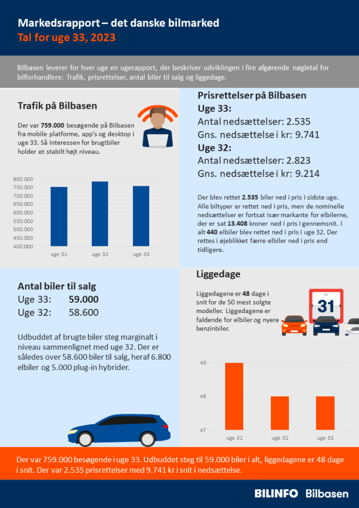 Der var 759.000 besøgende i uge 33. Udbuddet steg til 59.000 biler i alt, liggedagene er 48 dage i snit. Der var 2.535 prisrettelser med 9.741 kr i snit i nedsættelse.