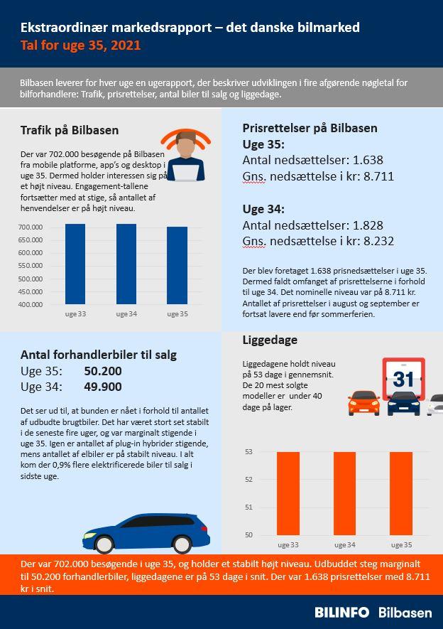 I korte træk for uge 35: Der var 702.000 besøgende i uge 35, og holder et stabilt højt niveau. Udbuddet steg marginalt til 50.200 forhandlerbiler, liggedagene er på 53 dage i snit. Der var 1.638 prisrettelser med 8.711 kr i snit.