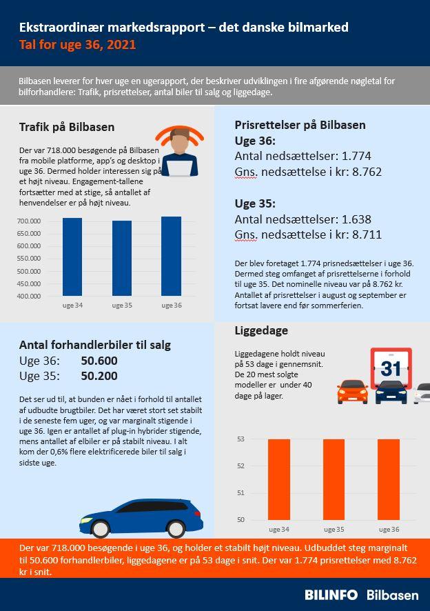 I korte træk for uge 36: Der var 718.000 besøgende i uge 36, og holder et stabilt højt niveau. Udbuddet steg marginalt til 50.600 forhandlerbiler, liggedagene er på 53 dage i snit. Der var 1.774 prisrettelser med 8.762 kr i snit.