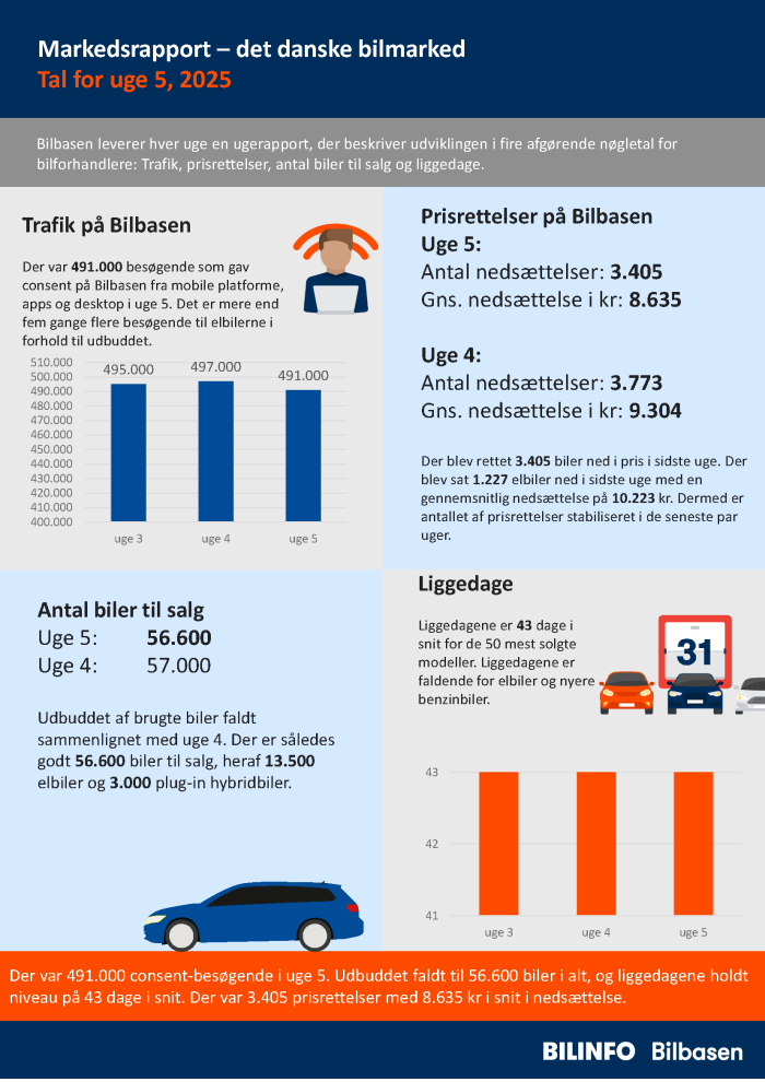 Der var 491.000 consent-besøgende i uge 5. Udbuddet faldt til 56.600 biler i alt, og liggedagene holdt niveau på 43 dage i snit. Der var 3.405 prisrettelser med 8.635 kr i snit i nedsættelse.