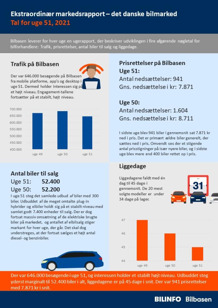 Der var 646.000 besøgende i uge 51, og interessen holder et stabilt højt niveau. Udbuddet steg yderst marginalt til 52.400 biler i alt, liggedagene er på 45 dage i snit. Der var 941 prisrettelser med 7.871 kr i snit.