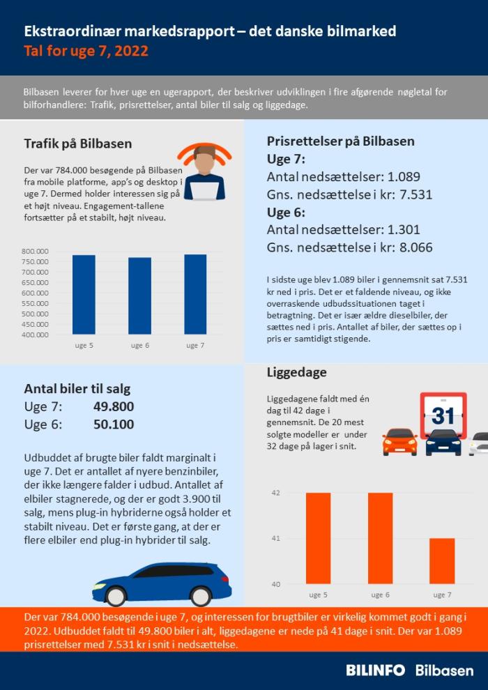 Der var 784.000 besøgende i uge 7, og interessen for brugtbiler er virkelig kommet godt i gang i 2022. Udbuddet faldt til 49.800 biler i alt, liggedagene er nede på 41 dage i snit. Der var 1.089 prisrettelser med 7.531 kr i snit i nedsættelse.