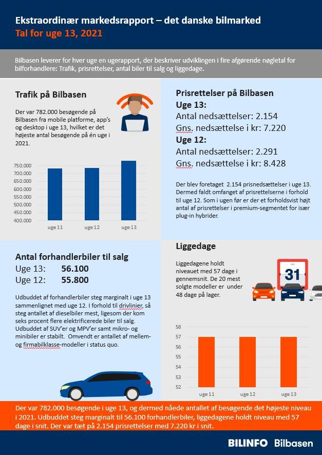 I korte træk: Der var 782.000 besøgende i uge 13, og dermed nåede antallet af besøgende det højeste niveau i 2021. Udbuddet steg marginalt til 56.100 forhandlerbiler, liggedagene holdt niveau med 57 dage i snit. Der var tæt på 2.154 prisrettelser med 7.220 kr i snit.