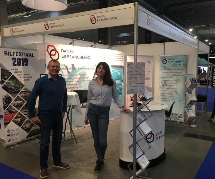 På billedet ses Dansk Bilbrancheråds stand på FTZ-messen i Odense og rådets to kørende konsulenter Pia Egerskov og René Eriksen.