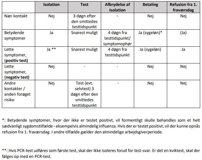 *: Betydende symptomer, hvor der ikke er testet positivt, vil formentligt skulle behandles som et helt sædvanligt sygdomstilfælde - eksempelvis almindelig influenza. Hvis der er testet positivt, vil der kunne opnås refusion fra 1. fraværsdag. I andre tilfælde gælder den almindelige arbejdsgiverperiode.