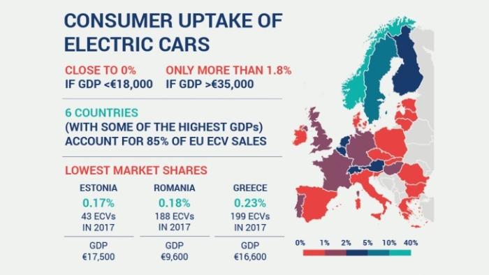 Illustrationen viser en stor forskel mellem Centraleuropa og Vesteuropa, når det gælder salget af eldrevne biler, men også en tydelig forskel mellem Syd- og Nordeuropa. Kun lande med et bruttonationalprodukt på mere end 261.000 kroner pr. capita har en andel af elbiler på mere end 1,8 procent ifølge ACEA’s undersøgelse.