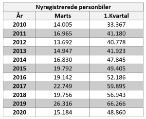Den nuværende situation med Covid-19 gør det svært at sammenligne perioderne. Men ved at kaste et blik på marts måned de foregående år, viser det sig, at efter nogle år med rekordstort bilsalg, skal tilbage til 2013 for at finde et tilsvarende lavt antal solgte nye biler.