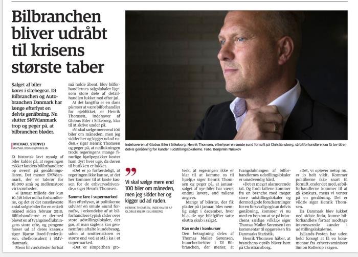 »I januar trillede der kun 10.316 biler ud fra forhandlerne, og det er det næstlaveste antal solgte biler for en enkelt måned siden februar 2010. Bilforhandlerne er dermed blevet en af tvangsnedlukningens store ofre, og pengene fosser ud af deres kasser,« siger Bjarne Roed-Frederiksen, chefkonsulent i SMVdanmark.