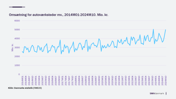 Omsætningen i autobranchen er steget fra ca. 2.500 millioner kr. (2,5 milliarder kr.) til ca. 4500 millioner kr. (4,5 milliard kr.) i 2024, hvilket ses på første billede til højre her i artiklen.