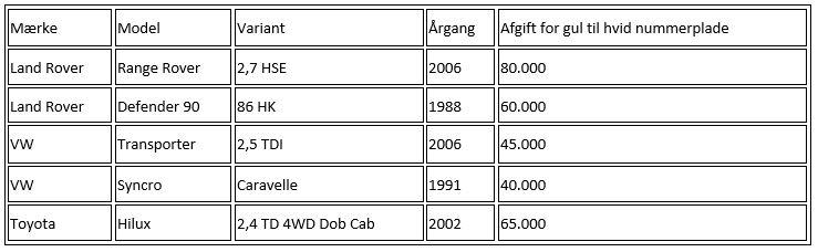 Motorstyrelsen oplyser, at det kun i ganske få tilfælde kan betale sig. I de fleste tilfælde er der ikke tale om en nogen besparelse, eller endog det modsatte. Herunder kan du se en række regneeksempler på, hvad der typisk skal betales i afgift for en række varebiler, hvis de skal omregistreres til at være personbiler. I nedenstående er der kun tale om cirkapriser, og afgiften kan variere i begge retninger, fordi hvert enkelt køretøj vurderes individuelt.