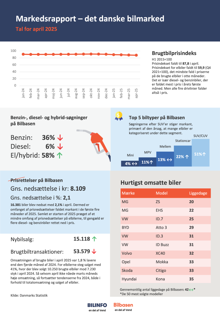 Antallet af transaktioner på brugtbilmarkedet faldt med 17,7% i april sammenlignet med marts måned, der var den bedste måned nogensinde i forhold til antallet af solgte brugtbiler. Men samlet ligger de første fire første måneder af 2025 fortsat 10,5% over rekordåret 2024 i forhold omsætningen på brugtbilmarkedet.